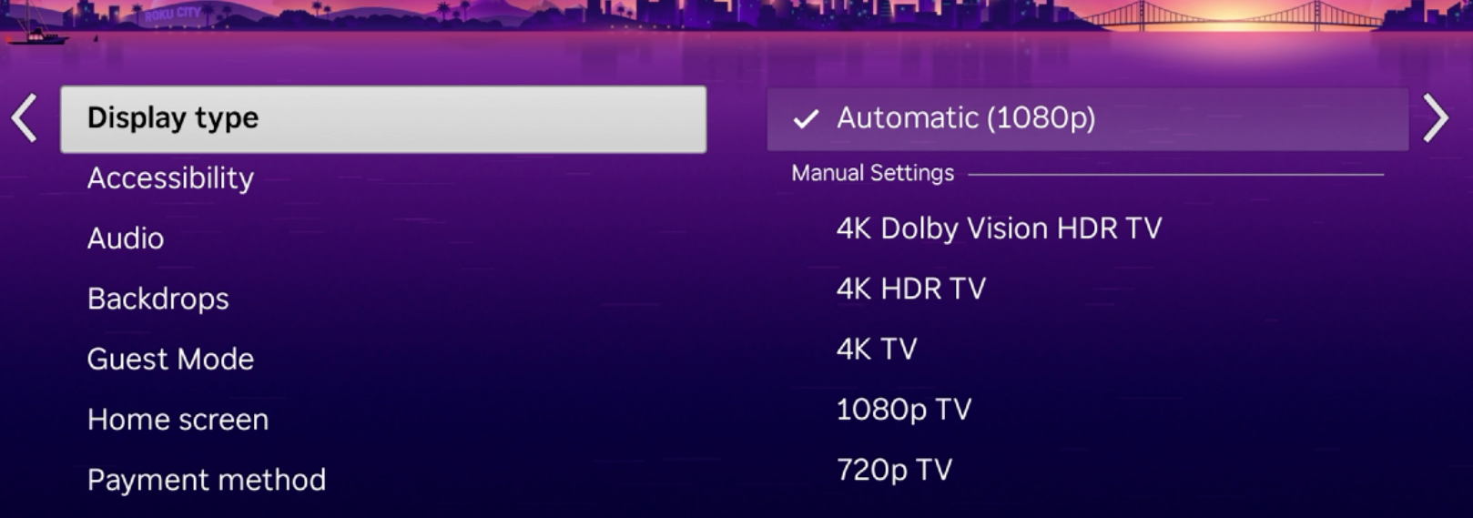 Después de ajustar la configuración de HDMI en tu AVR o barra de sonido, comprueba nuevamente las opciones de la conexión HDMI. Para ello, ve a Configuración > Tipo de pantalla > Automático en tu reproductor Roku.