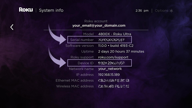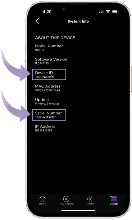 sur ta télécommande RokuL'écran À propos liste beaucoup d'informations à propos de votre appareil Roku. Recherchez les champs étiquetés Numéro de série et ID appareil (surlignés ci-dessous).