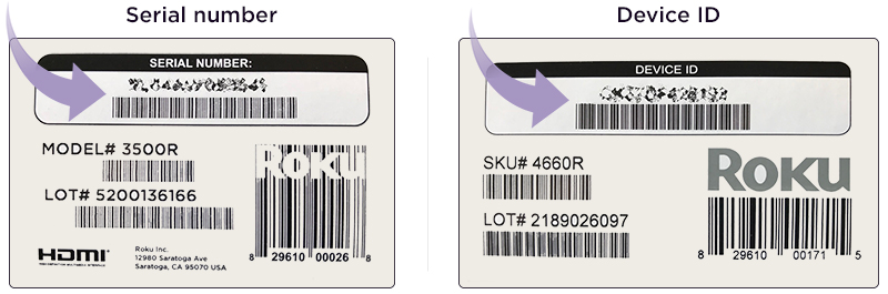 Chaque lecteur Roku et appareil audio Roku a son numéro de série ou ID d'appareil gravé au bas ou au dos du produit. Sur certains, ces renseignements sont imprimés sur une étiquette de produit accolée au lecteur ou à l'appareil audio. Sur d'autres, les renseignements sont imprimés directement sur le lecteur ou l'appareil audio.