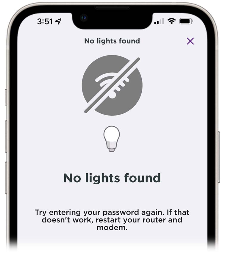 Roku Smart Home mobile app error screen showing 'No lights found'