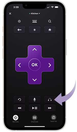 Mise en évidence du bouton Casque sur la page Télécommande de l’application mobile Roku