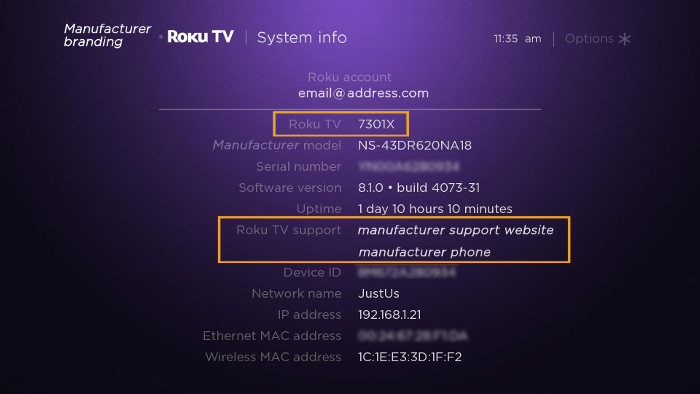 on your Roku remote.When you view the System info page, look for the field titled "Roku TV" that lists the Roku model number. With a Roku player or Streaming Stick, this field is titled "model". You can also look for the field titled "Roku TV support" that lists the manufacturer's contact information. With a player or Streaming Stick, this field is titled "Roku support" and it lists roku.com/support for the contact information.