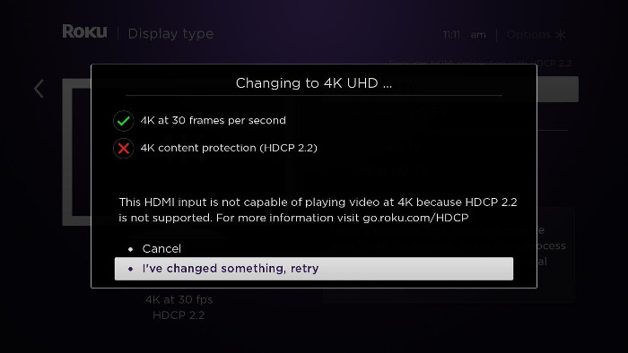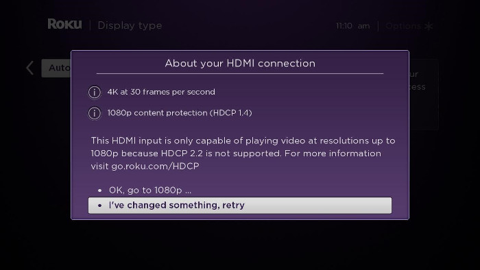 If your Roku player does not detect support for HDCP 2.2, you may see the following message during setup: