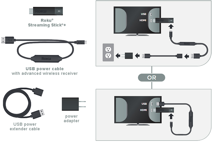 If your Roku Streaming Stick+ will not easily connect to the HDMI port on your TV due to space restrictions, then you may wish to get a free HDMI extender cable.Next, plug the USB power cable with advanced wireless receiver into a suitable power source – either the USB port on your TV, or preferably, a wall outlet (when used with the USB power extender cable and power adapter).