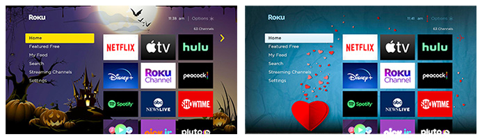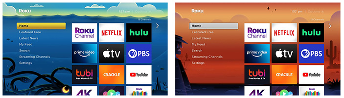 From the color and style of the menus to the image that appears in the background to the screensaver and navigation sounds, a theme pack defines the overall look and feel of the Roku interface. Changing the theme pack is a simple way to personalize your Roku experience with a single selection. A default theme pack is included with your Roku streaming player or Roku TV™, while additional theme packs are available for free download from the settings menu on your Roku device.