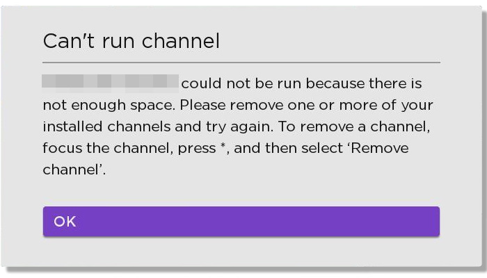 If you receive one of the following errors: "Not enough memory,""Can't run app" or "Insufficient memory" when opening an app on your Roku® streaming device, you may be experiencing an internet connection issue or low storage space on your Roku device.