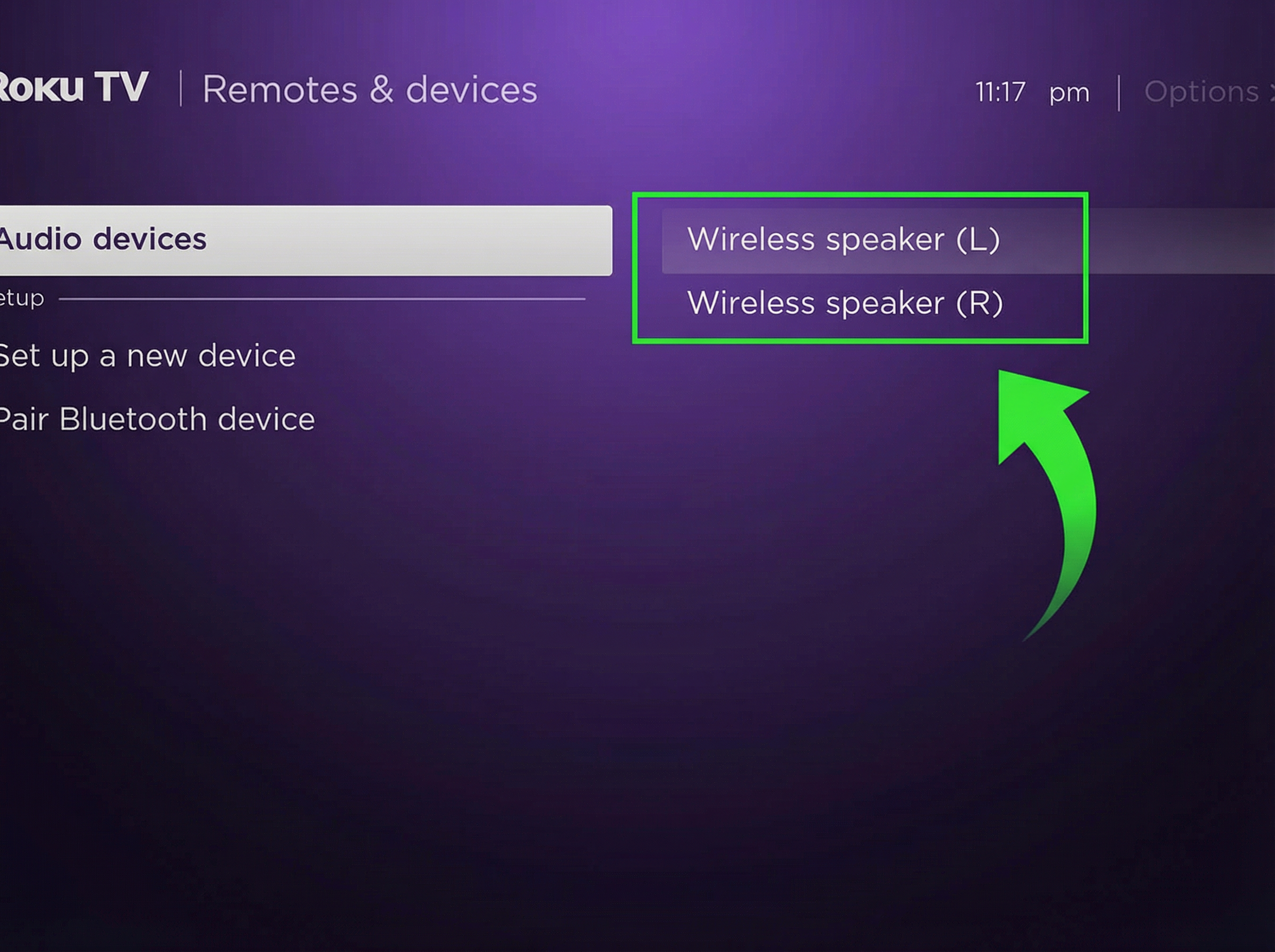 your Roku remoteOn this screen, you will see Wireless speaker (L) and Wireless speaker (R) when your wireless speakers are connected to your TV.