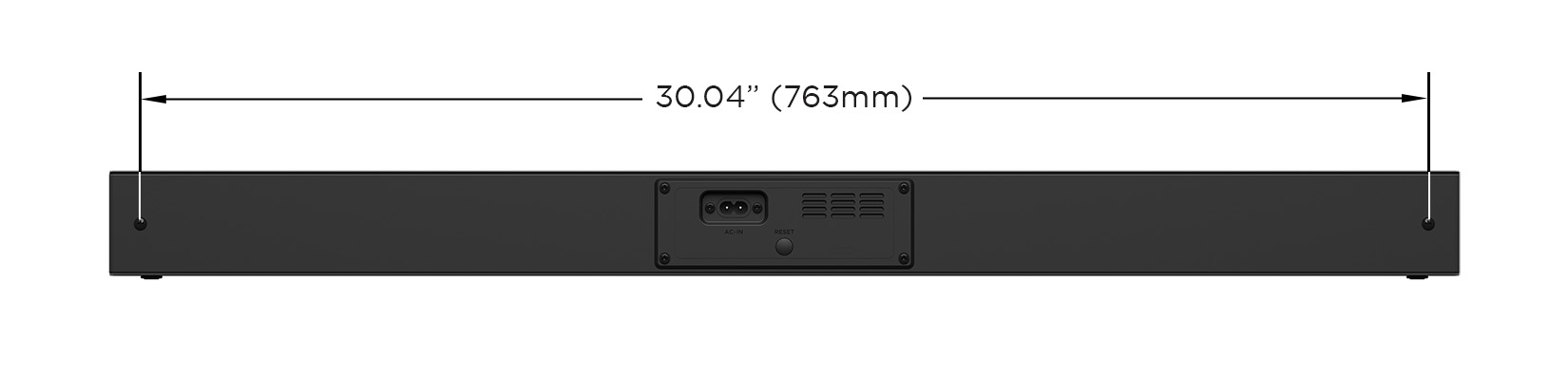 The wireless soundbar mounting sockets are located on the rear of the device, 30.04 inches (763mm) apart. Any mount used with your soundbar must support a minimum weight of 5.1 pounds (2.3 kg).