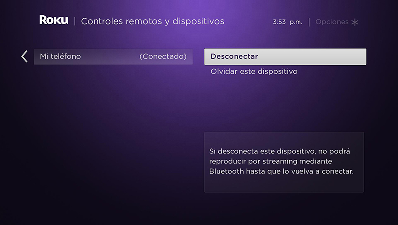 Cuando desconectes un teléfono inteligente, una tableta o una computadora de tu dispositivo Roku compatible, seguirá estando en la lista de “Mis dispositivos emparejados”, ya que solo está desconectado de la sesión de Bluetooth actual. Puedes seguir estos pasos para desconectar manualmente tu dispositivo Bluetooth en caso de que el canal Bluetooth se abra de forma inesperada.