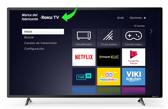 Roku funciona con una variedad de fabricantes de TV que diseñan las Roku TV con distintos tamaños de pantalla, precios y resoluciones de imagen. Por lo general, en la parte frontal de la pantalla no solo verás la marca del fabricante, sino también el logotipo de Roku TV en la esquina.