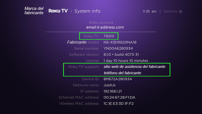 en el control remoto Roku.Cuando veas la página de “Información del sistema”, busca el campo con el título “Roku TV” que indica el número de modelo de Roku. En el caso de un reproductor Roku o Streaming Stick, a este campo se le denomina “modelo”. También puedes buscar el campo titulado “Servicio de asistencia de Roku TV”, en el que se indica la información de contacto del fabricante. En el caso de un reproductor o un Streaming Stick, este campo se denomina “Servicio de asistencia de Roku” y figura roku.com/support en la información de contacto.