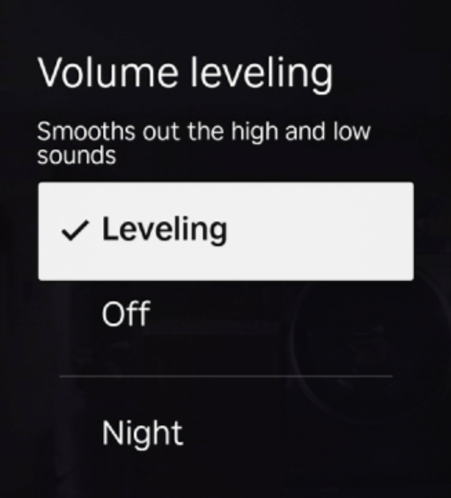 Nota: La nivelación de volumen no está disponible para todos los dispositivos de streaming Roku. Además, algunos dispositivos solo tienen los modos Nivelación y Nocturno.