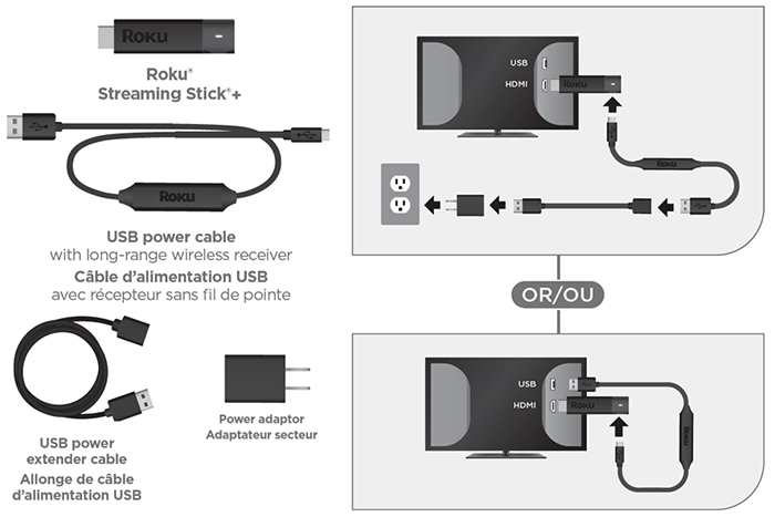 Utilisez les schémas ci-dessous pour vous guider dans la connexion de votre Roku Streaming Stick+. Assurez-vous que toutes les connexions sont branchées fermement.