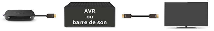 Pour réussir à diffuser du contenu 4K, tous les appareils connectés à votre appareil Roku compatible doivent être compatibles aux normes HDMI 2.0 et HDCP 2.2. Cela inclut votre téléviseur, un récepteur audio/vidéo (AVR) et tout autre périphérique connecté entre eux. Si un seul appareil ne prend pas en charge les normes HDMI 2.0 et HDCP 2.2, le film ou l'émission télévisée en 4K ne peut être visionné qu'en résolution plus faible, telle que 720p ou 1080p.